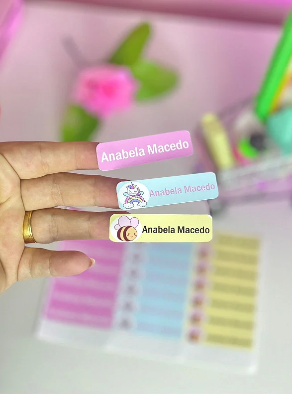 Cada etiqueta vem com acabamento preparado para aplicação rápida e segura. A impressão destaca o nome com cores e imagens personalizadas, auxiliando a identificação rápida das peças.