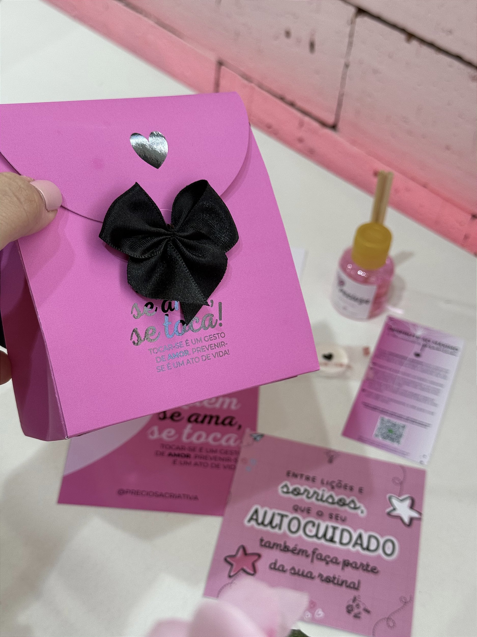 Cada kit acompanha bolsinha com alças em cetim + lacinho. Card agradecimento, mini máscara facial, cartão de orientações de cuidados com QR CODE que encaminha para uma playlist secreta + aromatizador de ambiente.